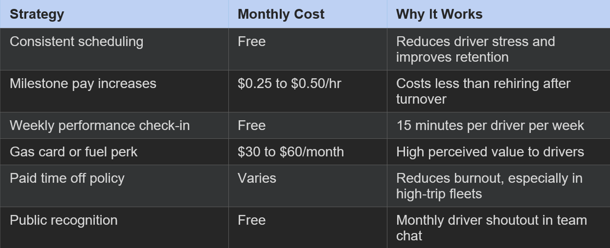 Yes. The retention strategies in this post are designed for exactly that scenario. Weekly check-ins take less than two hours total per week for a 7 to 10 vehicle fleet. A milestone pay structure runs itself once the policy is written. Advance scheduling requires one focused block of time each week, typically under an hour. The monthly recognition system takes 15 minutes. None of these require a dedicated HR role. They require consistency from whoever manages the drivers, whether that is the owner, a lead dispatcher, or an operations manager.