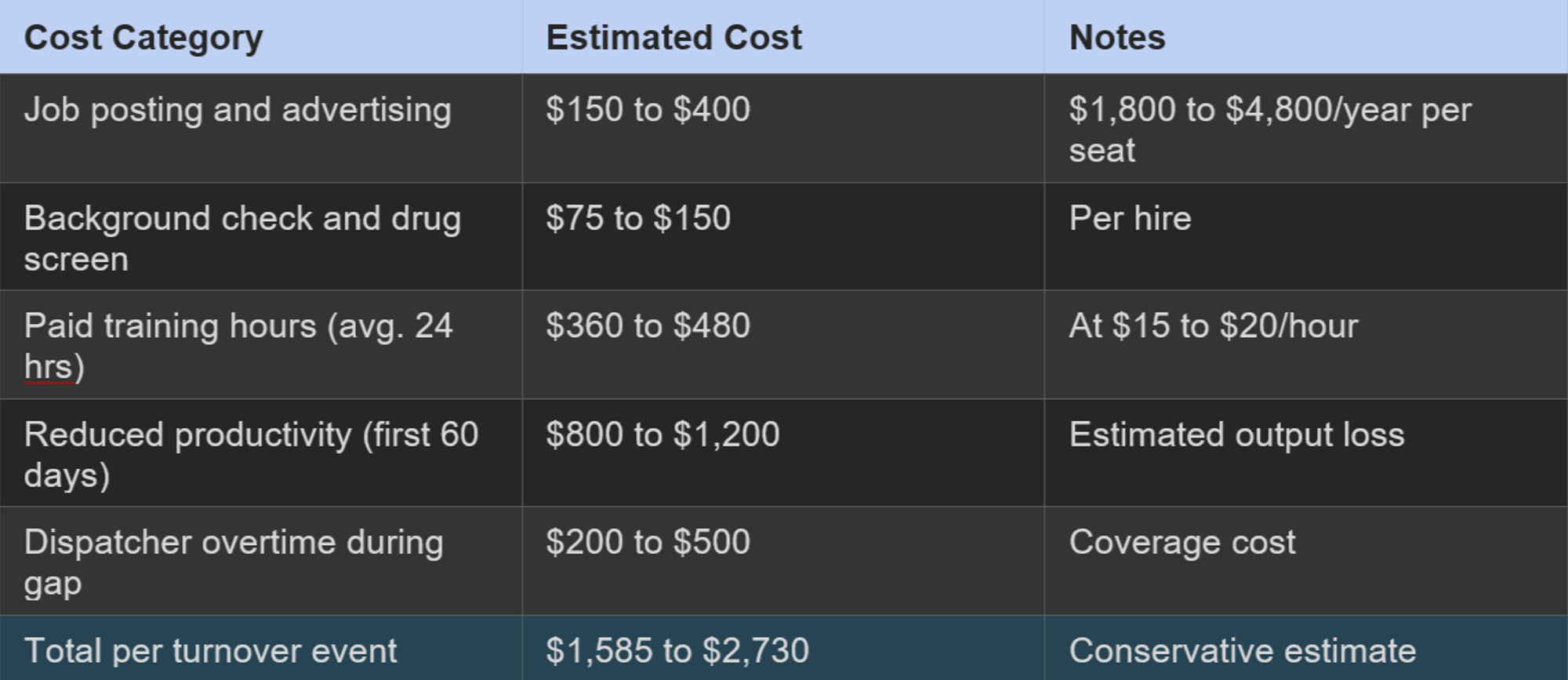 The total cost for a driver who reaches the 2-year mark is roughly $1.50 per hour above starting pay, or approximately $3,120 per year for a full-time driver. That is less than the cost of replacing them once.