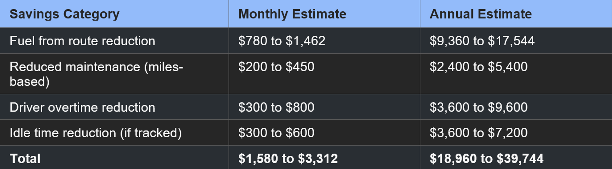 Fleets that correct vehicle assignment errors see an additional 5% to 8% reduction in total operating costs on top of their route savings.